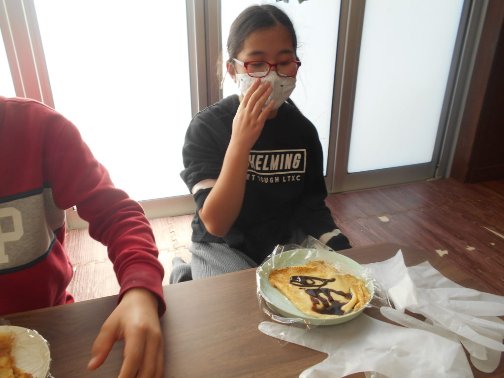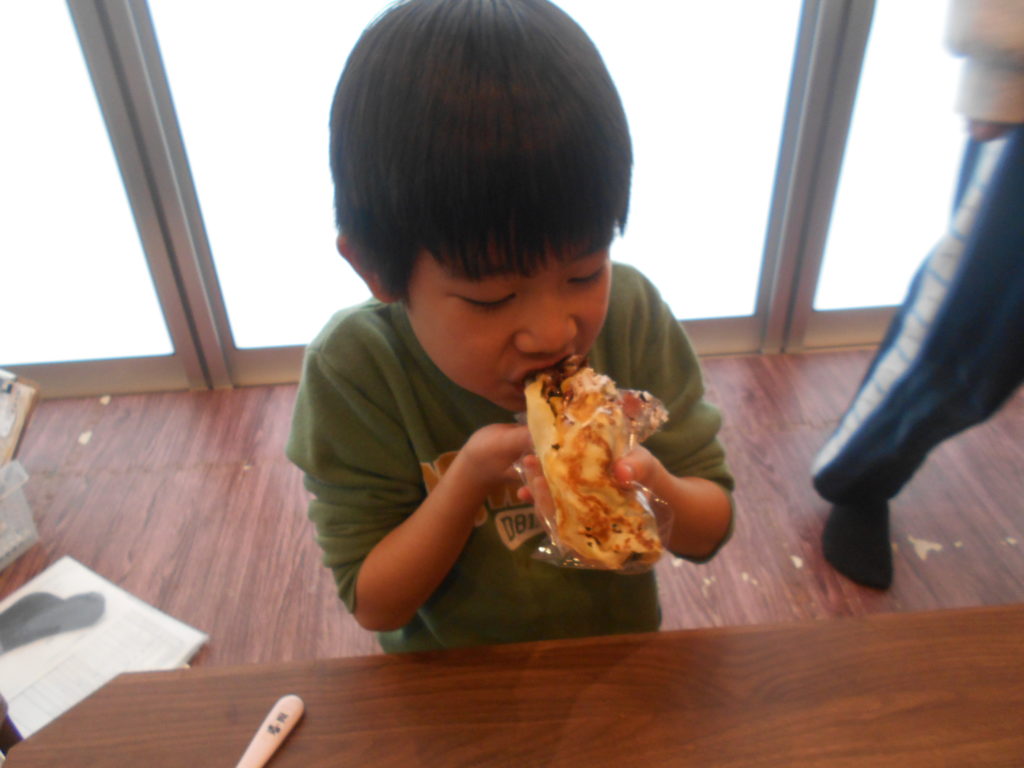 チョコレートソースやクリーム、フルーツを入れて巻きました。
